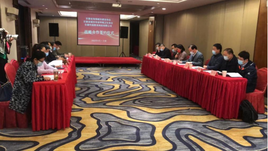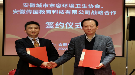 2022年4月4日下午,安徽省海绵城市建设协会、安徽省城市市容环境卫生协会、安徽传国教育科技有限公司在喜百年宴会酒店三楼会议室举办了签约仪式,签署了战略合作协议。安徽省海绵城市建设协会会长,安徽省城市市容环境卫生协会理事长蔡新立、安徽省海绵城市建设协会专家委委员朱曙光、安徽省海绵城市协会副秘书长孙柏、安徽传国教育科技有限公司总经理江传国等领导、嘉宾出席了签约仪式,共同见证这一重要时刻。