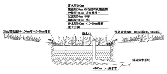自然形成或人工挖掘的下凹式绿地,种植灌木、花草,形成小型雨水滞留入 渗设施,用于收集来自屋顶或地面的雨水,利用土壤和植物的过滤作用净化雨水, 暂时滞留雨水并使之逐渐渗入土壤。