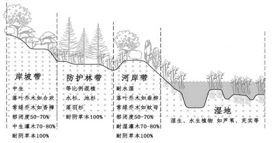 包括陆生植物群落以及布设在其中的防汛通道、游步道、慢行道、休憩平台、 人工湿地、下凹式绿地、植草沟等设施。