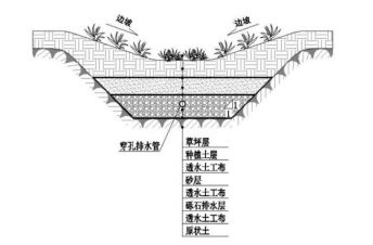 用来收集、输送和净化雨水的表面覆盖植被的明渠,可用于衔接其他海绵城 市单项设施、城市雨水管渠和超标雨水径流排放系统。主要型式有转输型植草沟、 渗透型的干式植草沟和经常有水的湿式植草沟。