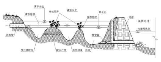 包括陆生植物群落以及布设在其中的防汛通道、游步道、慢行道、休憩平台、 人工湿地、下沉式绿地、植草沟等设施。