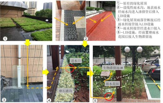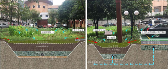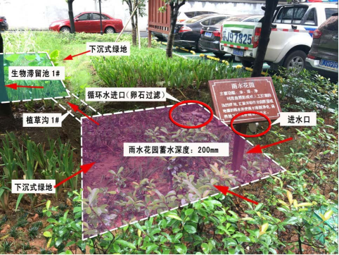 进行初期拦截过滤,再通过自然溢流至生物滞留池,雨水花园积水时间比生物滞
