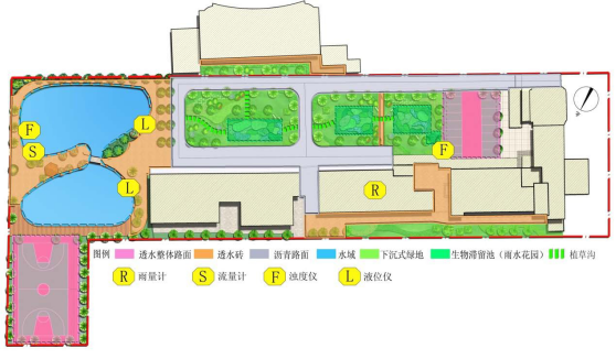的出水处,分别安装了 2 台流量计、1 台浊度仪、2 台液位计(其中一台用于与 另一台做对比分析),建设局小区屋顶安装 1 台雨量计,对项目区的径流总量控 制率和径流污染中 SS 进行实时在线监测(见图 10-36)。