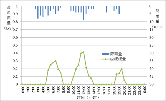 监测数据评估:项目区雨水最终通过景观水池溢流口溢流至市政管网,因此 在景观水池设施出水口处安装了流量计用来监测项目区径流控制过程。以 7 月