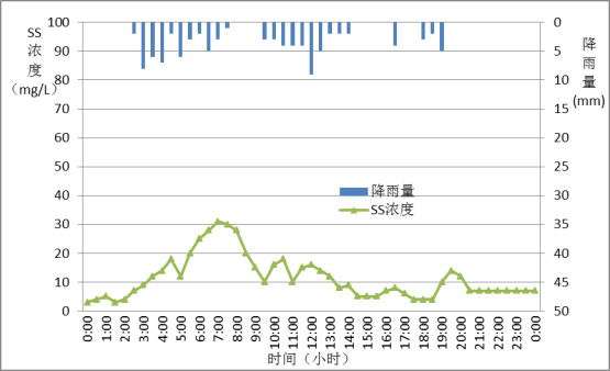 18 日降雨事件作为场降雨进行评估,见图 23 和图 24,根据项目区出口流量计和 雨量计监测数据评估该项目年径流总量控制和径流污染 SS 控制效果。该日累积 降雨量为 96.8mm,经统计当累积降雨量达到 26.2mm 时发生了小流量溢流,对 应径流总量控制率为 79%。项目区出口处 SS 监测最高浓度为 28.3 mg/L,平均 浓度为 10.2mg/L。由于项目区实施前未有 SS 浓度监测数据,采用距离最近,位 于朝阳南路海璐烟酒行门口(周边项目尚未启动)浊度仪数据作为改造前参考值, 其平均浓度为 41.0 mg/L,因此评估得到项目区 SS 去除率达到了 74.9%。考虑监 测设备安装及运行时间较短有一定误差,其径流总量控制率和径流污染 SS 控制 率的运行效果仍需长期监测评估。
