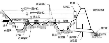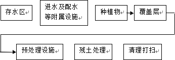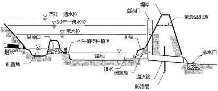 雨水湿地由沉淀区域、深水区、低沼泽地带、高沼泽地带、干湿交替带、微 池和出口设施组成。