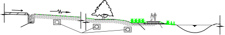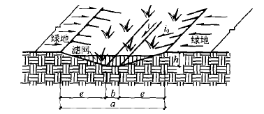 植被缓冲带为坡度较缓的植被区,经植被拦截及土壤入渗作用减缓地表径流 流速,并去除径流中的部分污染物,植被缓冲带坡度一般为 2%-6%,宽度不宜小 于 2 m。植被缓冲带典型构造如下图所示。