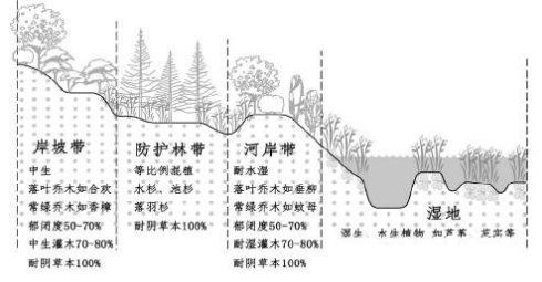③通过植物配置,从水体到陆域形成以沉水、浮叶、挺水和陆生