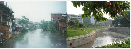 我国城市水环境综合治理工程的开展可追溯到上世纪九十年代,如我院参加设计的南宁市朝阳溪环境综合治理工程、海口市美舍河环境综合整治工程等。这些工程在建设前都存在严重的行洪排涝问题,两岸建筑凌乱,环境状况恶劣(见图1)。工程建成后非常显著地改善了当时的城市环境,被称为“德政工程”“民心工程”(见图1)。受历史条件所限,如果按现在的眼光看,这一批工程肯定存在这样或那样的问题。首先是经常被诟病的河道“三面光”和“覆盖”问题。造成这一类问题的主要原因是老城区河道两岸建筑密集,要使河道满足行洪排涝标准和截污的要求,就需要扩大河道断面和沿河两岸敷设截污管线,毫无疑问会进行大面积的拆迁工作,而当时的财力和拆迁安置能力是十分有限的。例如南方某城市的水环境综合治理工程中考虑过3个方案,即自然生态边坡的“全明”方案、上游覆盖下游敞开的“半暗半明”方案、上下游全覆盖的“全暗”方案。从参数方面分析,采用1∶3不等的自然边坡设计(糙率0.025,边坡稳定),河道上口宽度显然要大于采用浆砌块石(糙率0.025)或钢筋混凝土(糙率0.014)结构的直立挡墙矩形断面宽度,再加上两岸截污管所占的位置,造成自然生态边坡“全明”方案中沿河两岸的拆迁量比“半暗半明”方案的增加了接近一倍,导致其拆迁费用和安置能力无法承受。另一个原因是城市的快速扩张需要大量的土地,沿河地块最为抢手,多数已被规划控制,甚至小区地块的边线就在河边上,使河道水系没有更多的治理空间;其次是河道水质的问题,当时水环境综合治理工程的首要目的是解决河道行洪排涝安全和治理沿河两岸脏、乱、差环境等迫切需要解决的民生问题,而城市的排水管线和污水处理厂都处在持续不断的“补缺”过程中,污水系统的构建尚不完善,基本上没有经过深度处理的再生水,也没有再生水管道系统,再加上截流倍数低、截污不彻底以及多头治水等原因,造成缺水城市无水可补、多水城市有水难补、河道水质难有改善、雨后溢流频繁有加,构建起来的水环境工程系统十分脆弱,更谈不上生态恢复。