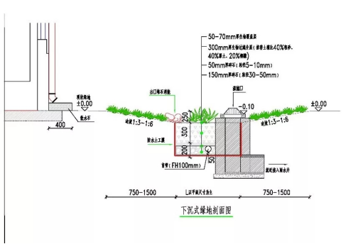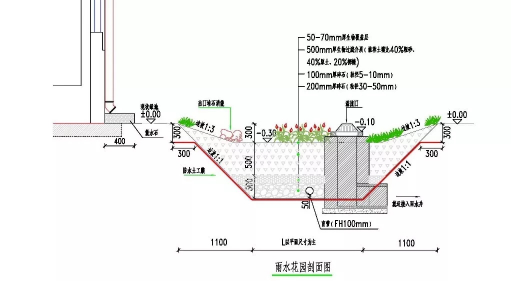 下沉式绿地:沟底标高比周边地面低25cm,主要布置在绿化面积较小、地下管线较多区域。下沉式绿地内设溢流雨水口,溢流雨水口低于周边地面10cm,高于下沉式绿地沟底15cm。为促进雨水入渗,防止雨水长时间蓄积,设计下沉式绿地均行局部换填,且设有防渗土工膜及盲管,换填区域结构参见雨水花园。