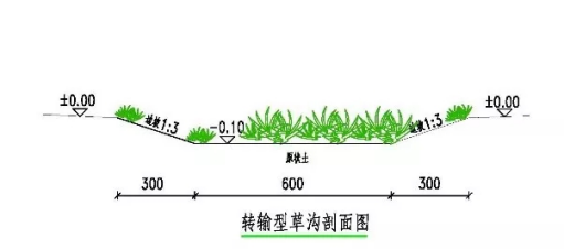 转输型草沟:主要作用为传输径流,将屋面和道路雨水径流导流至雨水花园集中处理。转输型草沟底部不需换土,坡向末端LID设施。种植要求高度为50~100mm左右的常绿草皮。