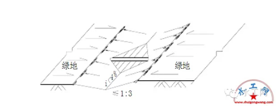 (2)植草沟的边坡坡度(垂直:水平)不宜大于1:3,纵坡不应大于4%。纵坡较大时宜设置为阶梯型植草沟或在中途设置消能台坎。