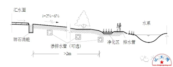 植被缓冲带为坡度较缓的植被区,经植被拦截及土壤下渗作用减缓地表径流流速,并去除径流中的部分污染物,植被缓冲带坡度一般为 2%-6%,宽度不宜小于2 m。