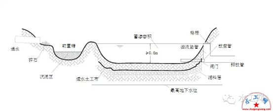 (2)渗透塘边坡坡度(垂直:水平)一般不大于1:3,塘底至溢流水位一般不小于0.6 m。