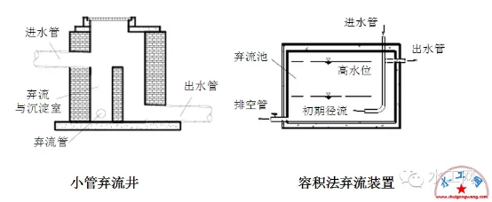 常见的初期弃流方法包括容积法弃流、小管弃流(水流切换法)等,弃流形式包括自控弃流、渗透弃流、弃流池、雨落管弃流等。适用于屋面雨水的雨落管、径流雨水的集中入口等低影响开发设施的前端。