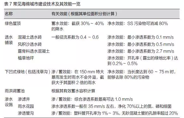 笔者认为,鉴于雨水渗透的重要意义,可增加对渗水设施的建设控制,即将建设控制指标扩展为雨洪调蓄池、下凹式绿地、透水铺装、绿色屋顶和渗水设施五大类。其标准数值的具体设定,除了可参考上述地区的已有经验,更重要的是从各项具体设施的实际效能( 表7) 出发,共同推导出一个合理的区间。