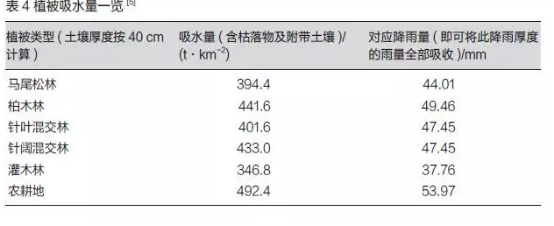 (1) 渗水指标,指控规单元内雨水渗入土壤、植被,最终汇入地下水系统的雨水比例( 渗入绿色屋顶的雨水,由于并未汇入地下,笔者认为应该算作蓄水)。该指标的计算方法多样,其中相对简单的方法可直接参考已有地区的经验,按年降雨量进行比例估算,如可参考深圳光明新城,其55%左右的年降雨量能被渗透吸收。如果要对其进行更精确的计算,就需要按照《指南》提出的“基本维持场地开发前后水文特征不变”的要求,分析地区未开发前的渗水量,一般选取土质或植被等要素,分别计算孔隙度和含水量等相关数据。在土质方面,粘土是渗透潜力最小的土壤类型,砂土的渗透潜力最大( 表3);在植被方面,由于植被与土壤难以剥离,实际上在计算其蓄水量时也会将土壤因素考虑在内,不同植被的吸水能力按针叶林、阔叶林、灌木、农田和草地依次递减[5],但在具体指标方面,大到受气候和土壤厚度等自然因素的影响,小到受植被郁闭度、密度和枯落度等自身情况的影响,导致不同地区植被的吸水能力差距较大,在此笔者仅列出中部地区常见植被的蓄水数据( 表4)。此外,在条件允许的情况下,还可进一步利用GIS 的地下水模型来分析地下水的水文情况,以提高数值的精准性,其分析因素包括土壤厚度、地下水位高程和含水层厚度等。在计算出开发前渗水量的基础上,可按美国LEED标准提出的1 ∶ 1 或1 ∶ 0.75( 开发前/开发后) 的标准来确定开发后的渗水量,然后根据不同的降雨厚度分别计算相应的渗水比例。