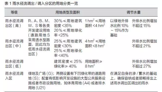 1.四大类分区:高、中、低雨水径流调出区和雨水径流调入区划分出雨水径流调出区和调入区是实现《指南》提出“基本维持场地开发前后水文特征不变”这一核心目标的重要基础。这是因为在单个地块层面,海绵城市的目标和现实之间存在“要求消化但又消化不了”的困境。所谓“要求消化”,是指《指南》中提出的开发地块要按场地开发前的绿地状态来控制雨水,而绿地的雨水外排率仅为10%~ 15% ,也就是说开发地块理论上要“消化”高达85%~ 90%的雨水;而“消化不了”是指在现实中任何开发都会将场地中原来的绿地变成建筑或者铺地,这势必会导致地块“消化”雨水的能力减弱。在我国,城市建设强度普遍较高,资金和技术又相对缺乏,即使按照目前国内较为先进的技术标准( 如以深圳光明新城为标杆),一般单个开发型地块( 如居住区和商业区) 在建设后仍然比建设前至少多出15%的雨水“无法消化”①。因此,只能退而求其次,通过跨地块间的雨水调节,即结合城市规划的用地类型,分成不同等级的雨水径流调入区( 如绿地、水体) 和调出区( 如各类居住区、商业区),在一定范围内实现雨水水文特征的平衡。在城市规划中,除去大型自然要素,一般雨水径流调入区( 即绿地) 的设置都是以2 ~ 10 km2 的控规单元( 北京称为“街区”,武汉称为“编制单元”,其余城市的提法基本类似) 为基本单元,那么跨地块进行雨水调节的范围,就应当与控规单元的范围进行统一。换言之,一般控规单元的界线就可当作雨水区域平衡的界线。因此,海绵城市控规导则中空间管控的第一步,就是基本参考控规单元的界线范围,通过整体统筹布局,将单元内的各地块划分成雨水径流调出区和调入区。参考一般控规中对各类用地的绿地率和建筑密度的相关控制要求,笔者尝试设置四个等级的雨水径流调出/ 调入分区( 表1),经过简化的下垫面渗透水率计算,可以实现雨水整体水文特征的平衡,并保证排泄顺畅。
