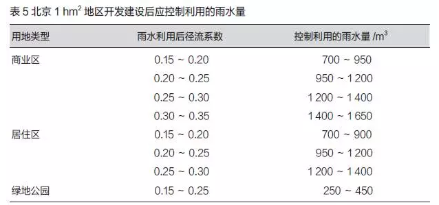 (5) 回用水指标,指控规单元内利用储存和调节的雨水,供工业冷却、景观浇灌和日常清洁等循环使用的水量。该指标数值的设置受所处的区域降水环境、用地类型和技术水平等多种因素的影响。例如,美国根据LEED 标准,一般将所节约的50%的雨水作为灌溉用水,而我国的标准相对较低,如深圳光明新城提出回用水量的比例在30%左右,北京提出按商业区、居住区和绿地公园三种用地类型分别设置不同的回用水量( 表5),结合当地的气象资料来看,其回用水比例也基本控制在30%~ 40%。