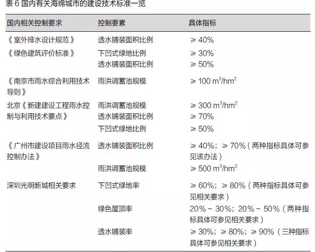 建设技术指标的建立目的是将五大类整体控制指标与各类海绵城市设施的工程设计标准进行挂钩。而按照国内有关的成果经验( 表6),建设技术指标一般包括雨洪调蓄池、下凹式绿地、透水铺装和绿色屋顶四大类。