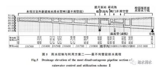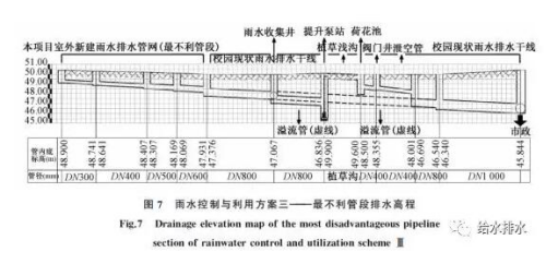 故本方案最终确定对南侧地块雨水进行收集调蓄,北侧地块雨水不做调蓄,直排至东侧干线,然后排至市政管网;雨水流向合理,南北地块排水畅通,保证了整个地块排水安全。最终雨水控制与利用方案平面布置见图6;最不利管段排水高程见图7。