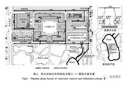 同时,本项目用地南侧仅一条马路之隔就是校园的绿色公园,公园内有1座景观水池(俗称荷花池),池深约2 m,水面面积3 300 m²,绿色生态环境较好,目前常年水位在1 m深,有超过1 m高度的调蓄空间,而且荷花池缺水较为严重,夏季每天需要向水池补充大量自来水。如果将本项目用地范围内的雨水收集补充到荷花池内,替代项目拟建的雨水调蓄池,既可以解决目前地块内无合适位置建设雨水调蓄池的难题,还可以节约利用宝贵的水资源。