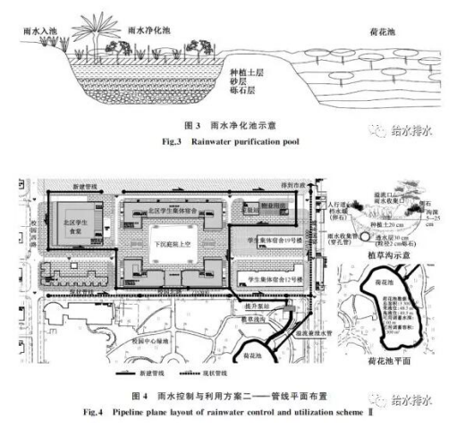 所以雨水控制和利用应充分利用周边景观水体、草坪绿地和低洼地等进行调蓄;设置雨水调蓄池等调蓄设施等、增加建设单位投资、留有安全隐患的方案,应充分论证后再考虑实施。而如本项目修改后的方案,充分利用现状荷花池作为调蓄设施,设置植草浅沟,水池入口设置可净化水体的水生植物,净化入池水体,简单易行,后期好管理,每年约可补充13 000 m³雨水,节约自来水,提高了综合效益,让物业管理有动力去维持设施正常运行,确保雨水控制与利用的可持续。