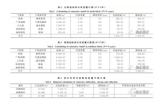 而对于第二条的调整,要求排水不逆向,北侧又无位置设置调蓄设施,只能是地块北侧雨水不做调蓄,直排至市政管网。此做法是否满足北京政策规范要求?按“雨控规”4.7.3条要求,通过计算可知,按5年重现期(降雨厚度141 mm)计算,外排雨水流量径流系数为0.45,同样按2年重现期(降雨厚度81 mm)计算,外排雨水流量径流系数为0.27,表明建成后,仅利用荷花池对南侧地块进行调蓄,即可满足雨水控制与利用要求。详细计算见表2~表4。