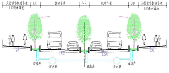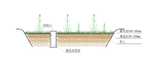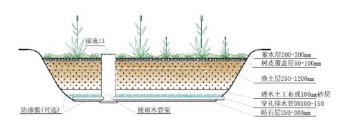 (3)生物滞留设施 生物滞留设施指在地势较低的区域,通过植物、土壤和微生物系统蓄渗、