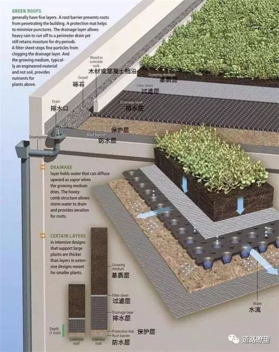 绿色屋顶又分为简单式和花园式,基质深度根据植物需求及屋顶荷载确定,简单式绿色屋顶的基质深度一般不大于150mm,花园式绿色屋顶在种植乔木时基质深度可超过600mm。
