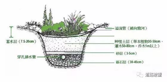 生物滞留设施指在地势较低的区域,通过植物、土壤和微生物系统蓄渗、净化径流雨水的设施。生物滞留设施分为简易型生物滞留设施和复杂型生物滞留设施,按应用位置不同又称作雨水花园、生物滞留带、高位花坛、生态树池等。