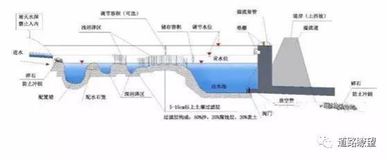 雨水湿地利用物理、水生植物及微生物等作用净化雨水,是一种高效的径流污染控制设施,雨水湿地分为雨水表流湿地和雨水潜流湿地,一般设计成防渗型以便维持雨水湿地植物所需要的水量, 雨水湿地常与湿塘合建并设计一定的调蓄容积。雨水湿地与湿塘的构造相似,一般由进水口、前置塘、沼泽区、出水池、溢流出水口、护坡及驳岸、维护通道等构成。