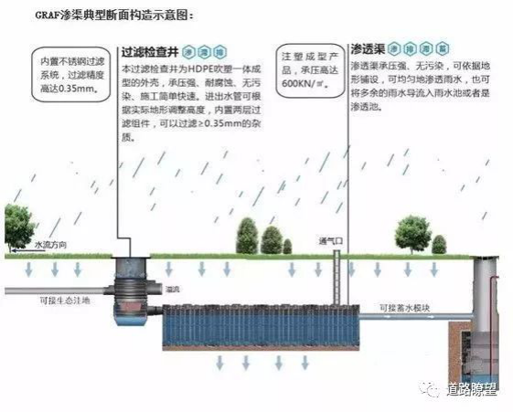 指具有渗透功能的雨水管/渠, 可采用穿孔塑料管、 无砂混凝土管/渠和砾(碎)石等材料组合而成。GRAF雨水渗透渠可线路铺设,也可两只渗透渠堆叠成管道状线路铺设,可以灵活地适应特定的条件和系统存储容量要求,进行产品的设计及安装。