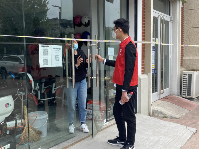 在雪霁路防疫点,另一组志愿者沿街巡逻,叮嘱管控区商户、居民做好个人防护,并不断劝返来往人员与车辆,帮助社区及时规避防控风险。