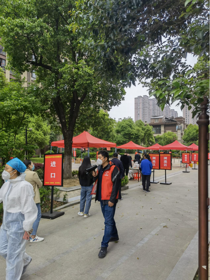 在大富山庄防疫点,一组志愿者深入疫区担当“守门员”,联合社区、物业工作人员为小区居民测量体温、维持秩序、完成核酸检测。当日协助大富山庄全区近7000人完成第一轮核酸检测工作。